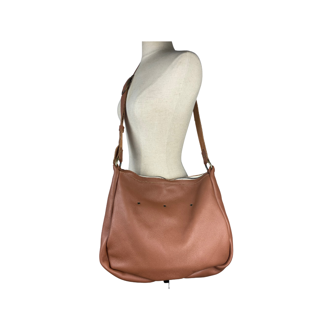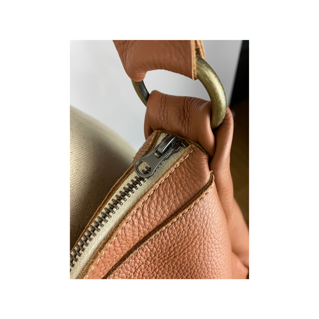 Peachy crossbody bag with adjustable cross strap and black quartz stone.